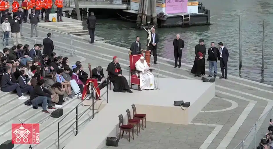 Palabras de esperanza dirigidas también a los jóvenes de la región del Triveneto, unos 1.500, reunidos en el atrio de la Basílica de Santa Maria della Salute, a la que llegó en lancha motora en una de las imágenes más representativas de la visita, entre los cánticos que resonaban en el muelle, el saludo de los gondoleros con los remos alzados (alzaremi) y los globos y pancartas que ondeaban desde las embarcaciones. A los chicos y chicas la invitación a «levantarnos del suelo porque estamos hechos para el cielo, levantarnos de la tristeza para mirar hacia arriba, levantarnos para ponernos delante de la vida, no sentados en el sofá».