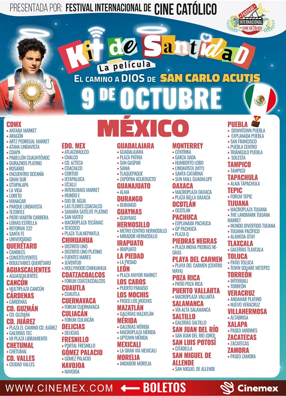 Kit de Santidad es una película mexicana sobre las prácticas espirituales que san Carlo Acutis vivió y recomendó. «Un método sencillo y poderoso para alcanzar la santidad; en la película lo conocerás y te inspirará a vivirlo”.