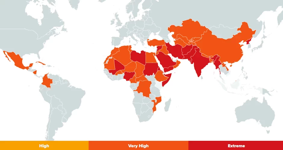 Según la Lista Mundial de Vigilancia, el número de países con niveles de persecución anticristiana que podrían describirse como “extremos” ha aumentado de 13 a 15. Corea del Norte sigue siendo el país donde es más peligroso ser cristiano. Sin embargo, la lista de países con un nivel preocupante de persecución también incluye a Somalia, Eritrea, Libia, Afganistán, Yemen, Sudán, Malí, Nigeria, Pakistán, Irán, India, Arabia Saudita, Myanmar y Siria. Según la Lista Mundial de Vigilancia, este último país ha pasado de “severo” a “extremo”.