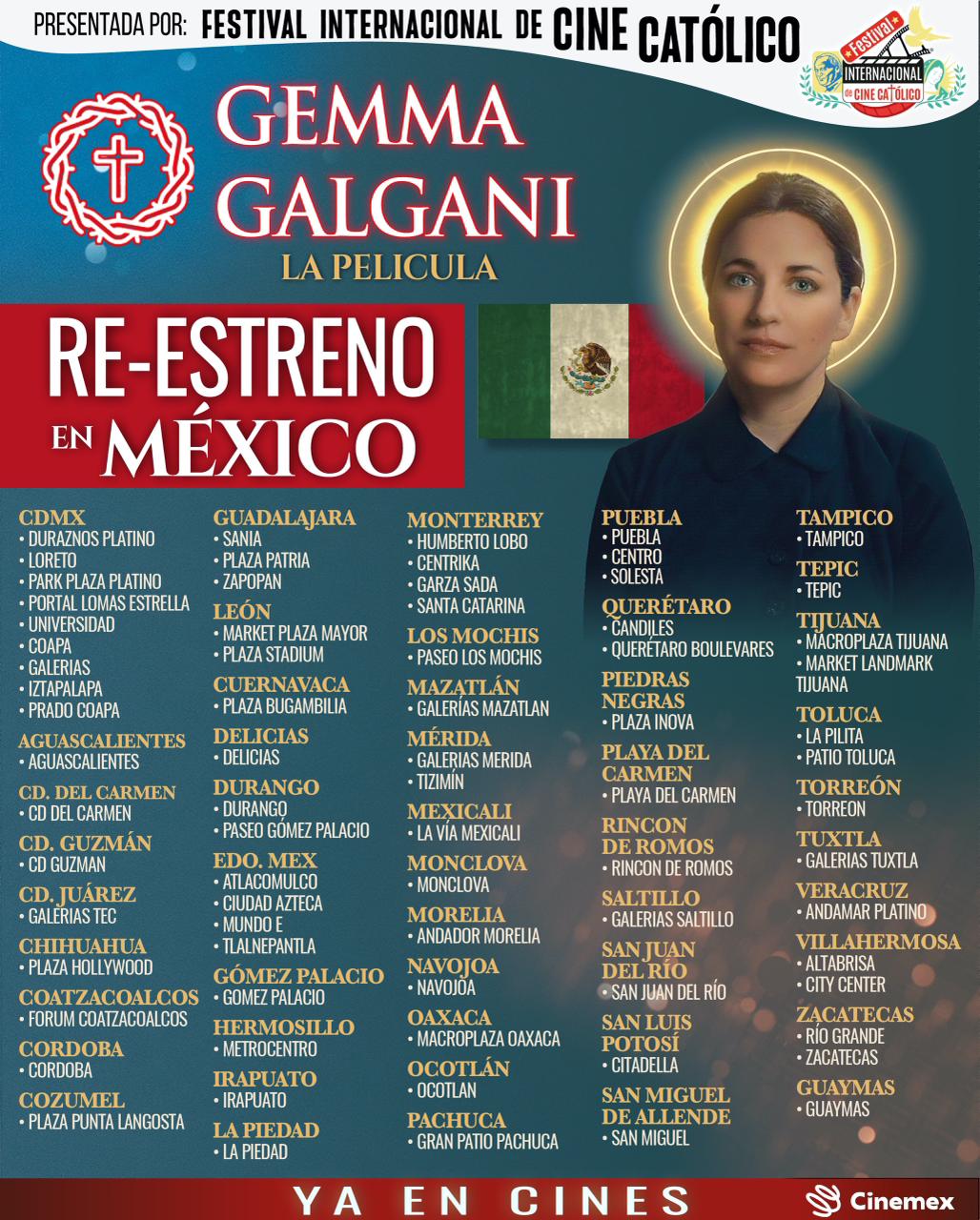 Por lo que queremos anunciar que gracias a Cinemex y al apoyo de todos ustedes, será el re-estreno este jueves 26 de febrero en todo México, de la película de Santa Gemma Galgani.